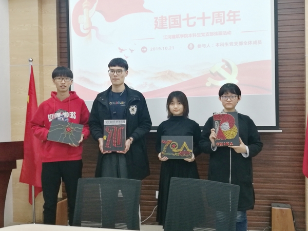 分享会结束后,支部举办“建国70周年”主题弦画活动。全体学生分小组认真排版,仔细制作,结合专业知识,以精美的弦画作品为祖国庆生。最终,支部评选出一等奖一组、二等奖一组、三等奖两组,并颁发了精美的奖品。
