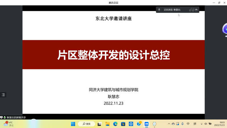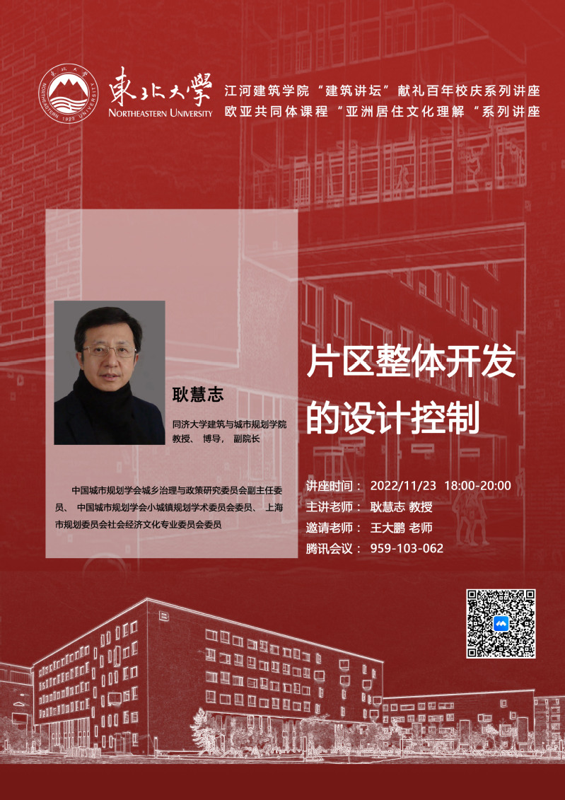 11月23日,应城乡规划系王大鹏老师邀请,同济大学建筑与城市规划学院副院长耿慧志教授做客半岛注册“建筑讲坛”(暨献礼百年校庆系列讲座),做题为《片区整体开发的设计控制》学术讲座,学院师生100余人参加线上交流。
