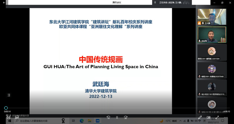 12月13日,应城乡规划系王大鹏老师邀请,清华大学建筑学院城市规划系主任武廷海教授做客半岛注册“建筑讲坛”(暨献礼百年校庆系列讲座),做题为《中国传统规画》的学术讲座,学院师生100余人参加线上交流。