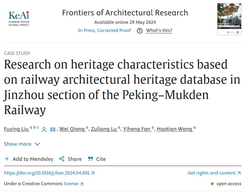 近日,我院建筑系刘抚英教授团队在中科院艺术学1区TOP期刊《Frontiers of Architectural Research》上发表题为“Research on heritage characteristics based on railway architectural heritage database in Jinzhou section of the PekingeMukden Railway”的论文。该研究成果以半岛注册为第一完成单位,刘抚英教授为第一作者及通讯作者,该成果与硕士研究生强唯(21级)、卢祖良(22级)、范译恒(19级)、王昊天(22级)等合作完成。