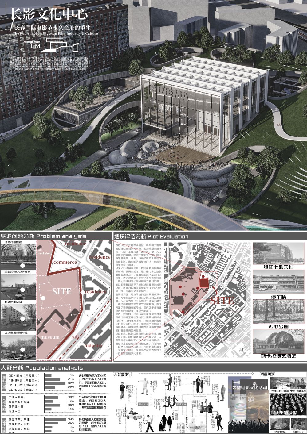 场地位于长春市绿园区的长春电影城公园旧址,立足于寒地城市产业存量更新议题,通过城市设计和建筑单体设计方式,实现文化传承与功能创新的融合。设计考虑解决周边及场地内部的混乱肌理,采用覆土建筑形式,营造整体性强的城市公园生态综合体,与周边商圈形成集群效应,为周边居民和游客提供休憩空间。内部空间充分利用自然光,提升体验感,同时设置步行道和景观节点,增强环境互动性。